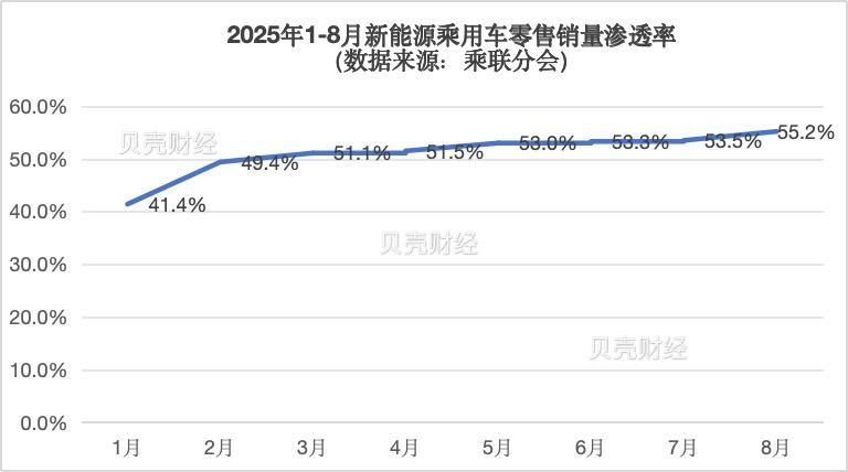 值得一提的是,自今年3月份以来,8月新能源车国内零售渗透率第6个月超50%,上升至55.2%,呈现出政策托底背景下的平稳增长态势。其中新能源乘用车出口同比增长102.7%至20.4万辆,占当月零售销量的18.5%。